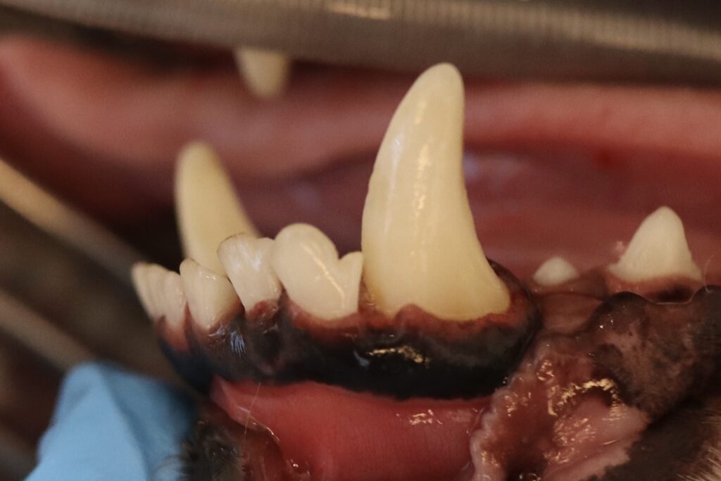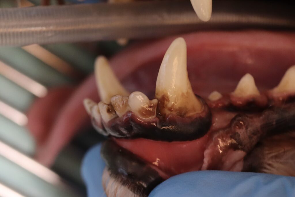 診察時、左下顎第三切歯と犬歯の間に深い歯周ポケットと明らかな骨吸収が認められました。歯列不正(叢生)により歯磨きが難しく、歯垢・歯石の蓄積が局所的に重度であることがわかりました。