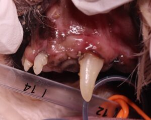 診察時、左下顎第三切歯と犬歯の間に深い歯周ポケットと明らかな骨吸収が認められました。歯列不正(叢生)により歯磨きが難しく、歯垢・歯石の蓄積が局所的に重度であることがわかりました。