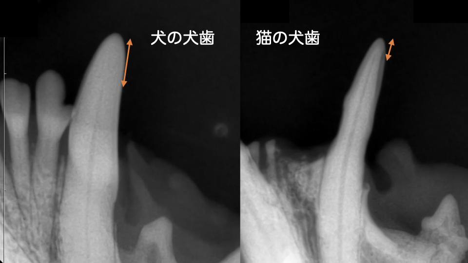 特に猫の犬歯は先端まで歯髄腔が通っているため、わずかに折れただけでも露髄が起こりやすい構造です。