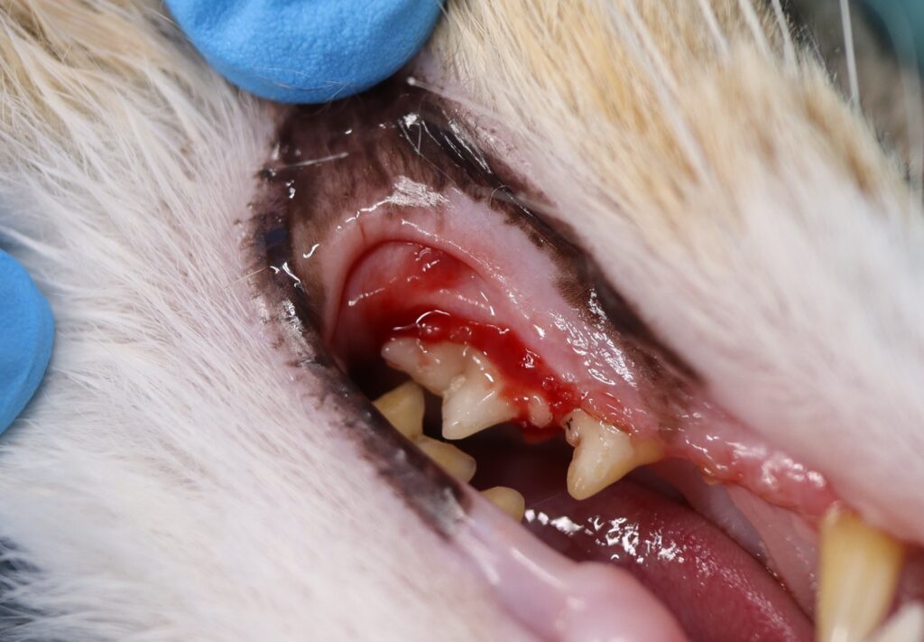 猫では、歯石や歯周病が原因で口腔粘膜に炎症や潰瘍ができることがあります。