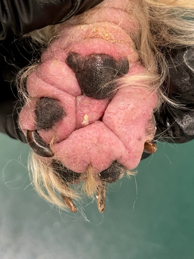 犬の皮膚リンパ腫で多いのが、落屑(フケ)を伴う赤い皮膚炎です。